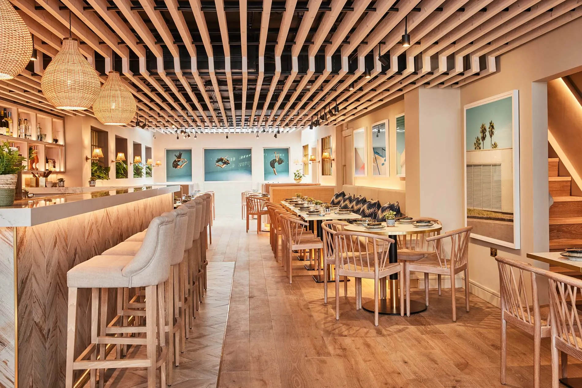 The architect’s ambition was to create a fresh and inviting destination restaurant for Chelsea’s vibrant dining scene. To evoke the high reflected light and calming ambiance of a seaside resort, we fabricated and installed timber banquettes and flooring along with a ‘sun-bleached’ timber-raft ceiling. Pale timber-clad bar and walls plus custom-made cushioned seating in driftwood colors completed the look.