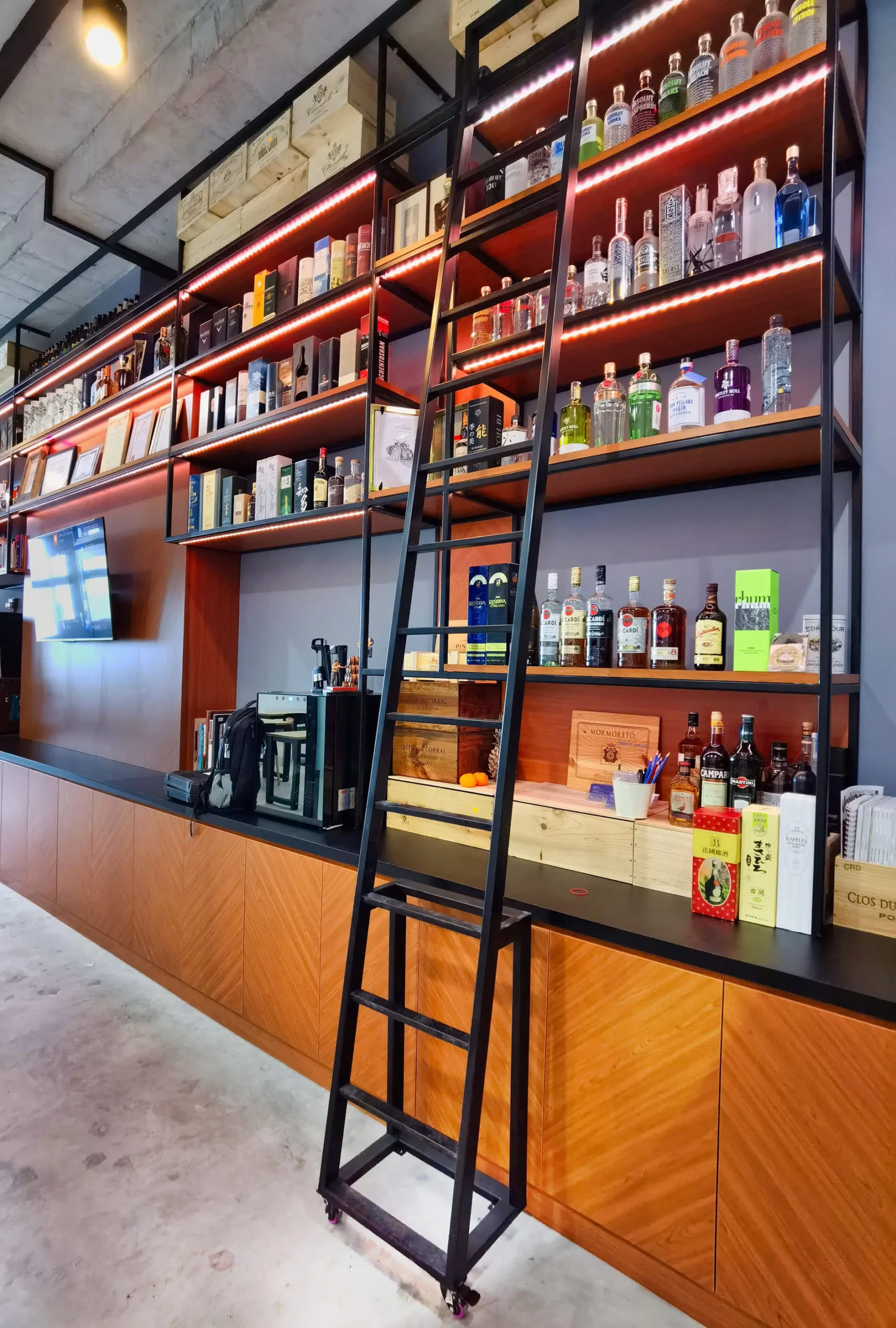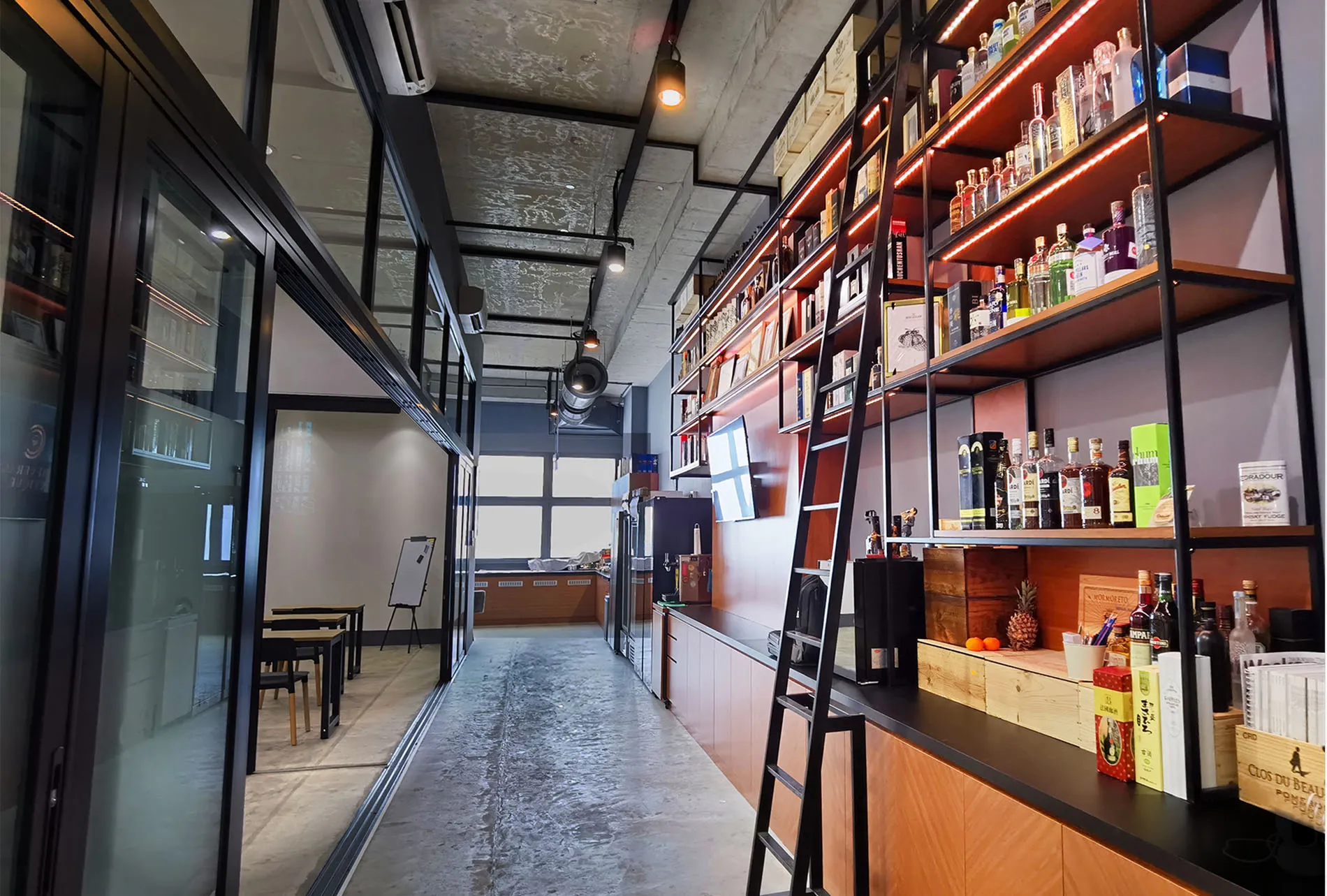 Flexibility and functionality were key requirements in this renovation of an office and training facility. A moveable ladder ensures easy access to the full height wall cabinet, and the sliding glass partitions convert the large classroom into two smaller areas. We were responsible for the design and build, as well as for project management and site installation. Completing on time meant our client could continue leading the way in providing hands-on training for professionals and enthusiasts of wine, spirits and saké.