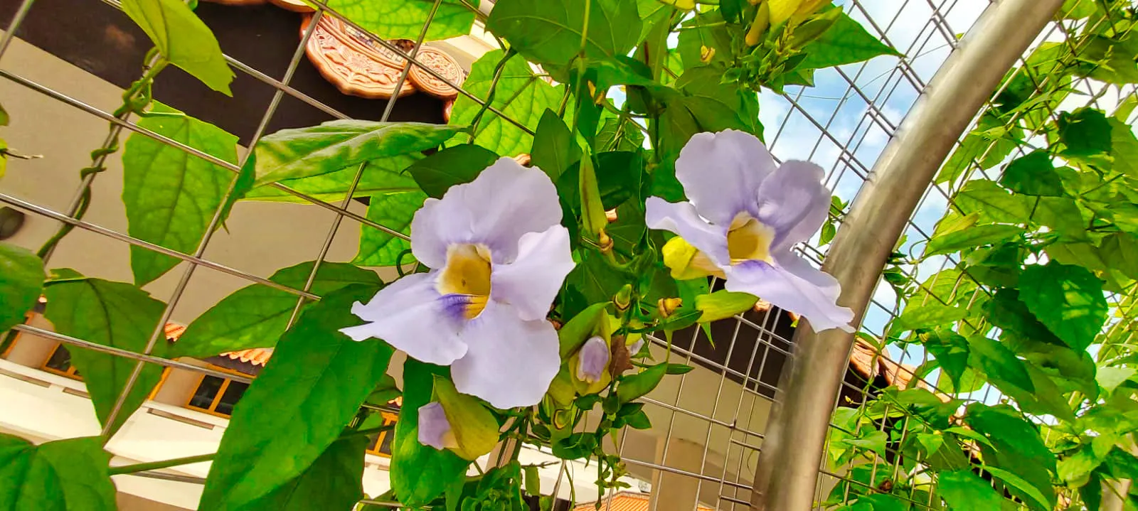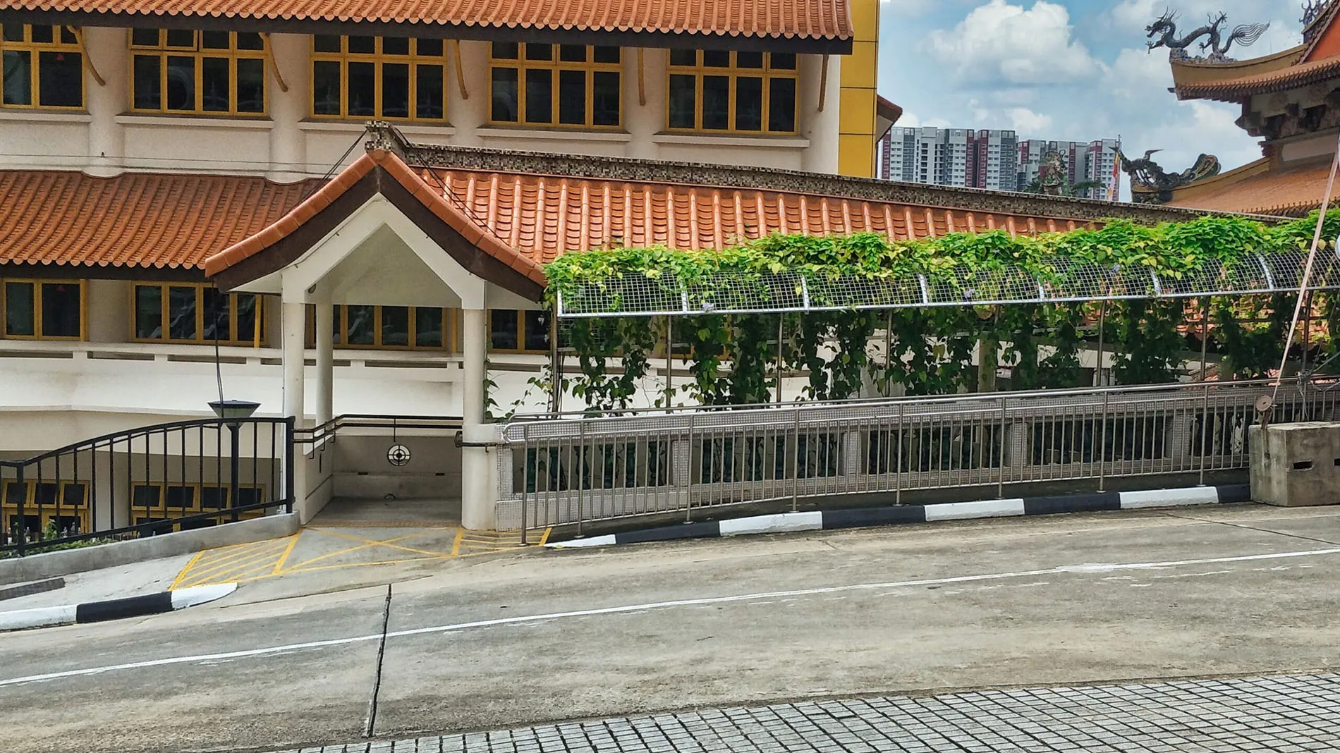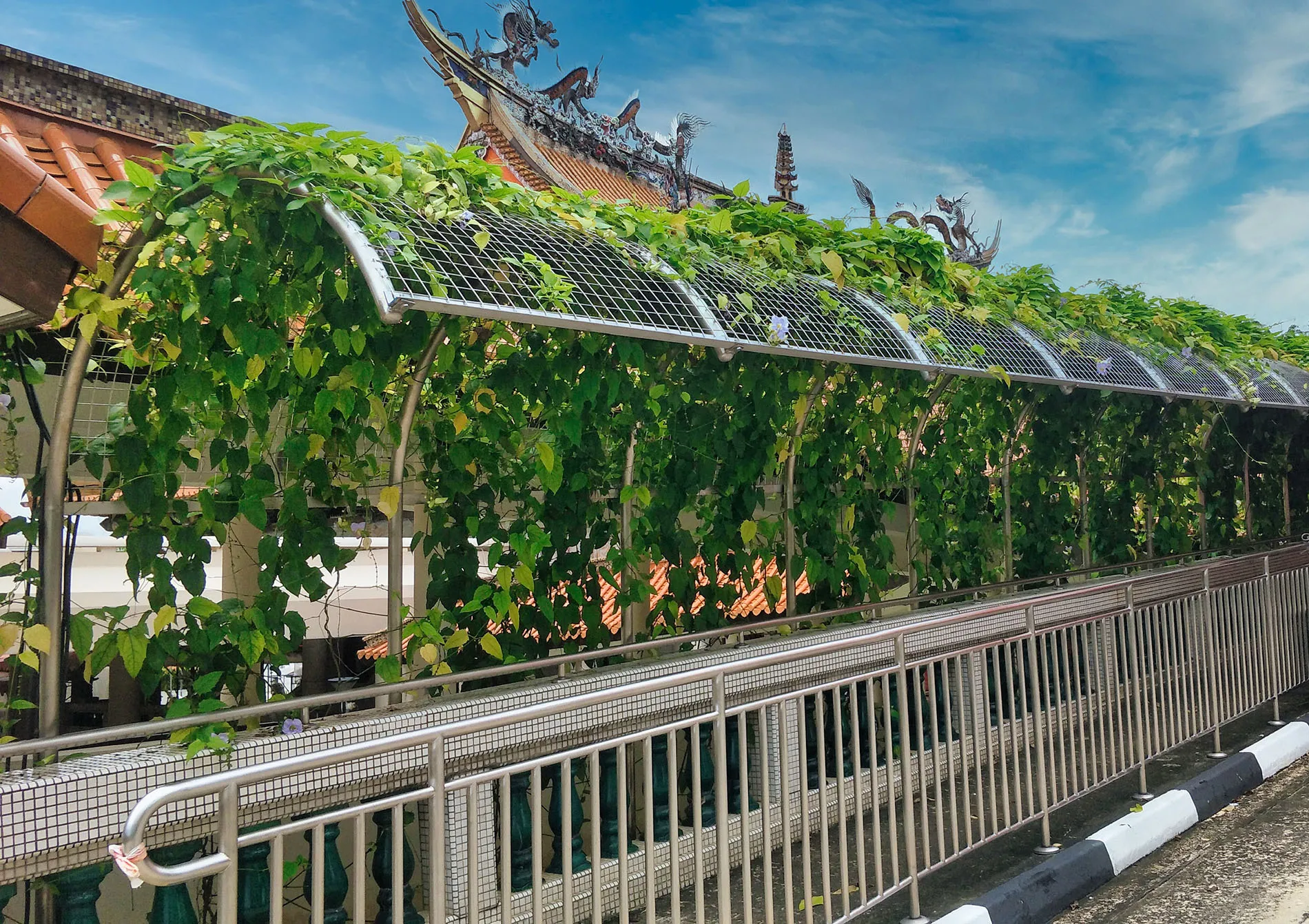 Kong Meng San Phor Kark See monastery is one of the most renowned Buddhist temples in Singapore. The challenge was to enhance and shade a busy walkway leading to the halls. Our solution was a curved canopy trellis in weatherproof stainless steel which we secured to the existing parapet. The planting had to withstand the heat of metal exposed to the noon sun and the client preferred flowers. Our horticulturalist recommended Blue Trumpet Vine (Thunbergia grandiflora) which made the perfect choice.